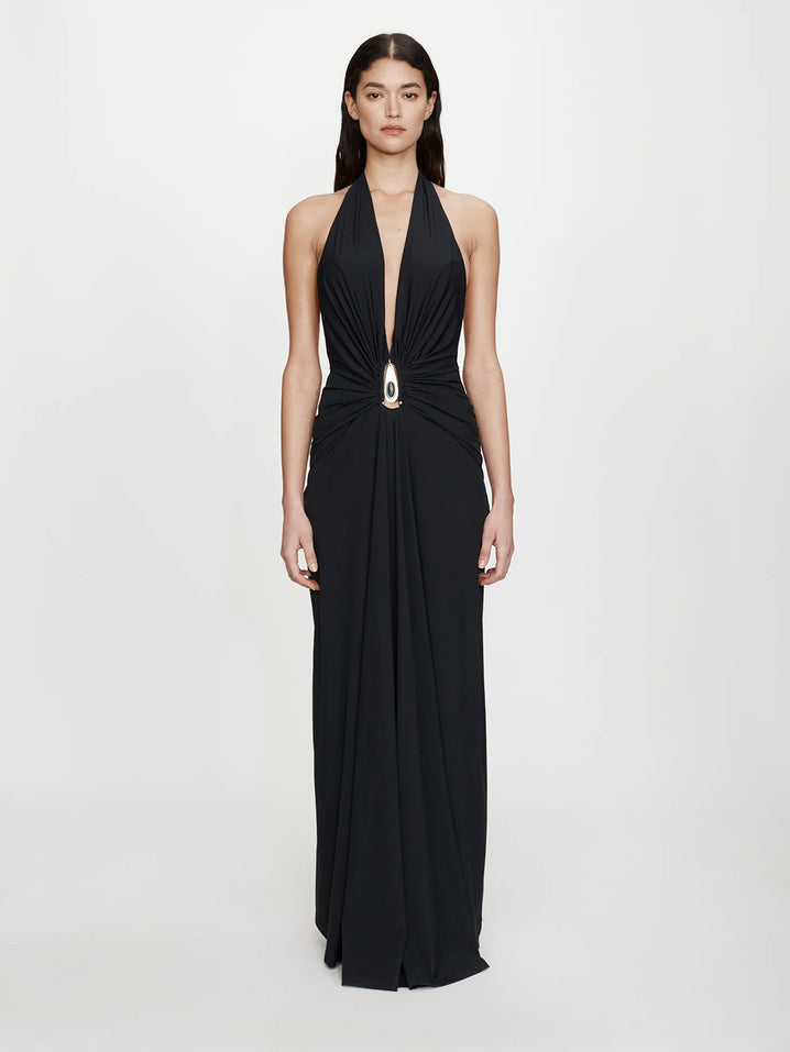 Crystal Pendant Ruched Lycra Halter Dress
